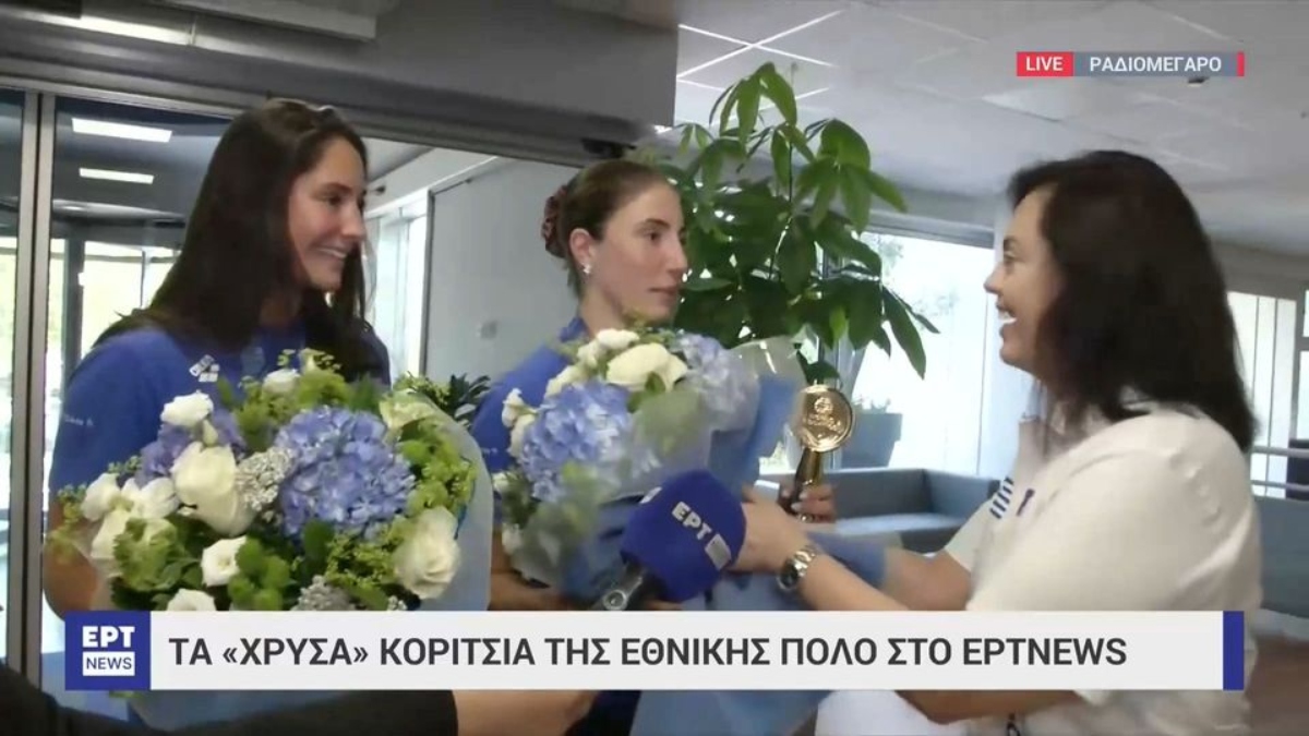 Με χαμόγελα, παρά το κουραστικό ταξίδι, αλλά και με το χρυσό μετάλλιο να φωτίζει τα πρόσωπά τους επέστρεψαν στην Αθήνα τα “χρυσά” κορίτσια της Εθνική μας ομάδα πόλο των γυναικών. Μάλιστα, η Ελευθερία και η Βασιλική Πλευρίτου, απευθείας από το αεροδρόμιο, έφτασαν στο Ραδιομέγαρο της ΕΡΤ, εκεί όπου τις υποδέχτηκε η Γενική Διευθύντρια προγράμματος της, Μαρία Κοζάκου. Στην συνέχεια οι δύο Παγκόσμιες Πρωταθλήτριες, μπήκαν στο στούντιο του Ertnews, για να μιλήσουν στην εκπομπή “Newsroom”.
